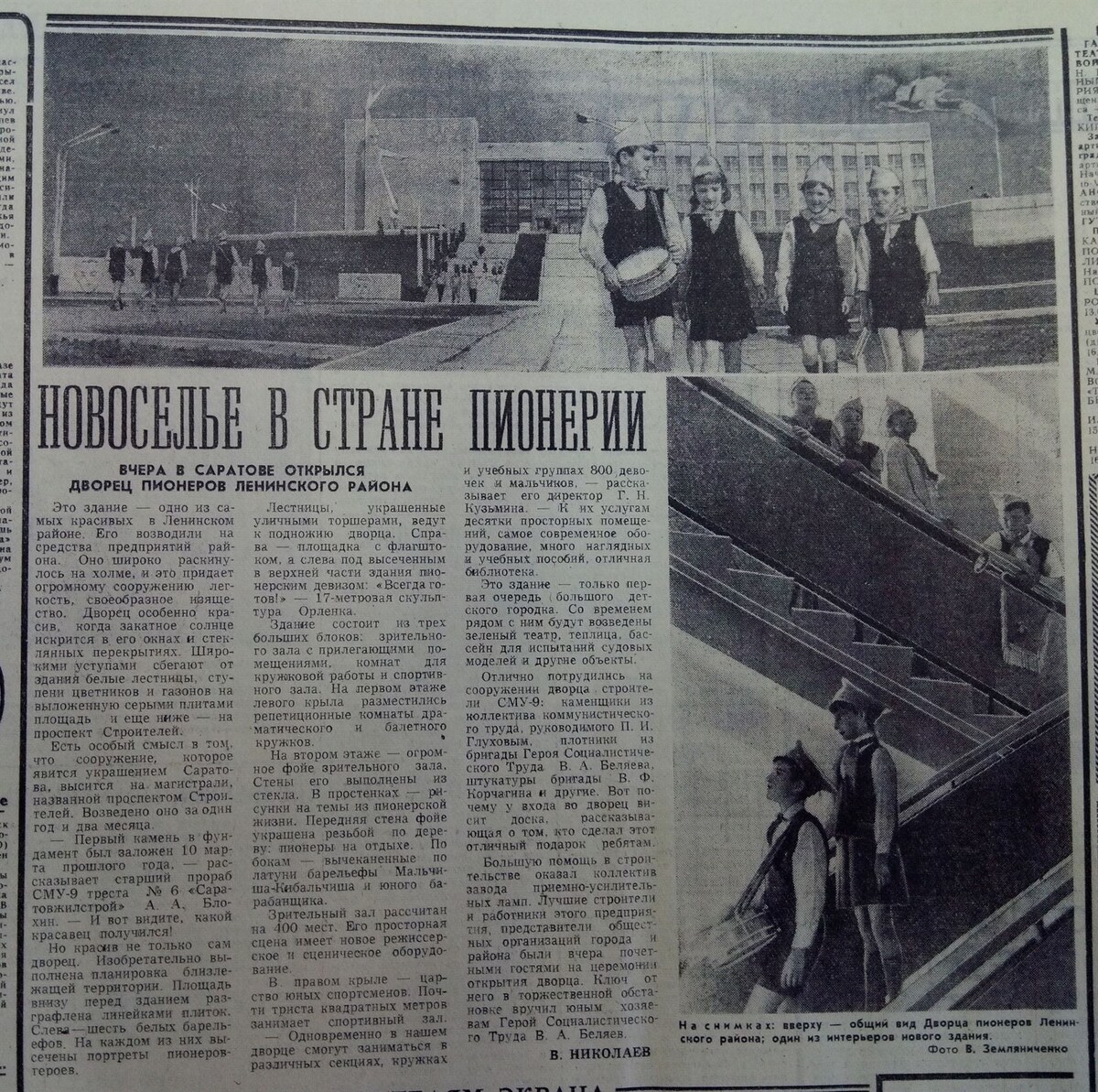 На днях побывал на территории сквера или как его еще называют, парка, "Территория детства". Записал видеообращение, написал пост. Получил в ответ волну негатива. Всякое бывает. На каждый роток не накинешь платок. Не успокоился. Снова съездил туда. На второй раз место показалось более родным. Вероятно потому, что уже знал куда еду. Меня заинтересовала история этого места. Покопался в краеведческих книжках, открытках, залез на сайт "госкаталог". Хочется поделиться находками. Дворец пионеров Ленинского района был возведён на месте бывшего мясокомбината на холме, возвышавшемся над Вольским трактом. Открытие состоялось в 1968 году, и на торжественной церемонии присутствовал второй советский космонавт Герман Титов. Вот что писалось об этом в газете "Коммунист" №136 (14701) за 13 июня 1968 года. Заметка из газеты "Заря молодежи" за 1969 год. 1960-е годы. Нашел в книге "Творцы саратовской электроники. Завод Рефлектор". 1970. Госкаталог. 1972. Госкаталог. Из набора открыток "Саратов" 1971 -