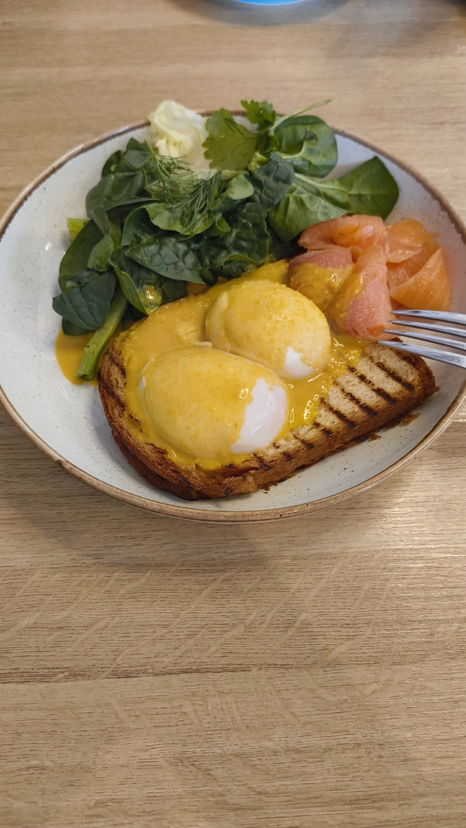«Шоколадница» для меня — значимый бренд. Я начал ходить под чутким присмотром бабушки ещё при Союзе в одноимённое кафе на Калужской площади. Потом «Шоколадница» стала сетью кафе. И иногда (примерно в начале десятых) там было всё очень сомнительного качества. Но они постоянно развиваются — моё мнение и предпочтения тоже меняются. Пару месяцев назад пробовал тогдашнюю новинку — «бейгл с начинкой», но посчитал это недостойным вашего внимания. С марта 2025-го происходит частичное обновление самих заведений, а меню обновится на 100%. Пробую новинку бенедикт на бриоши со слабосолёным лососем. Блюдо подали в глубокой тарелке. Всё очень выразительно и объёмно: свежие и крупные листья шпината, немного соуса голландез, красивые и правильные яйца на румяном кусочке бриоши, немного ломтиков лосося. Красиво и аппетитно. Яйцо правильно приготовлено. Первым делом хочется разломить его, чтобы желток начал медленно вытекать на хлеб. С этого я начал, и союз тоста и яйца сложился идеально. Если кусочки