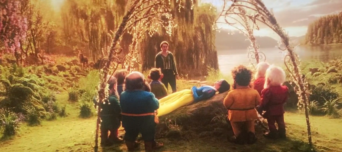 Или например, согласно сюжету Королева-мачеха убивает отца Белоснежки. Но как это произошло нам не покажут, зачем? Лучше покажем как король ушел с войском в туман, а на словах потом мимоходом скажем о том, что королева его убила!