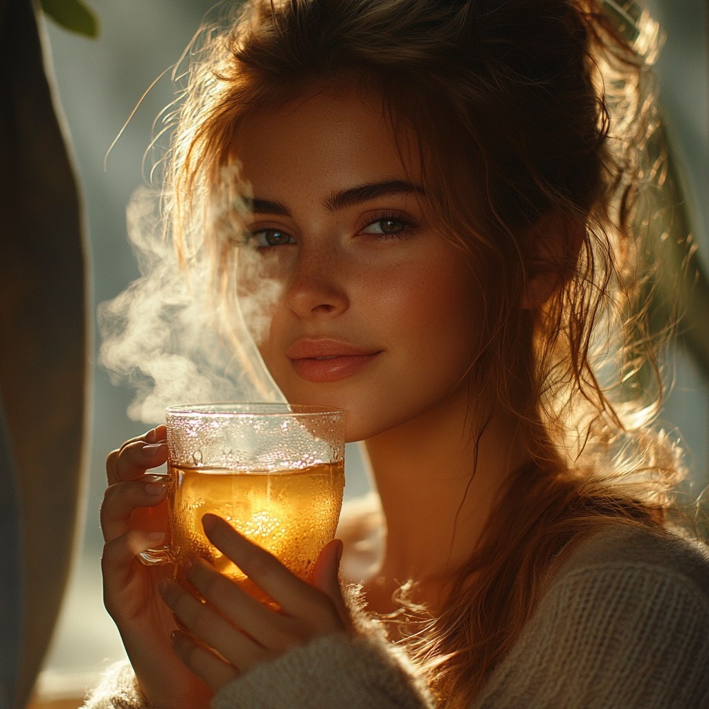 Создано на основе запроса: A single woman with a serene expression, sipping warm lemon tea from a transparent glass. The steam gently rises, illuminated by soft natural light. The setting is minimalistic and calming, with a touch of greenery in the background. Her posture reflects relaxation and self-care, symbolizing detoxification and wellness. Hyper-realistic, soft focus, warm tones, cinematic lighting, 8K UHD