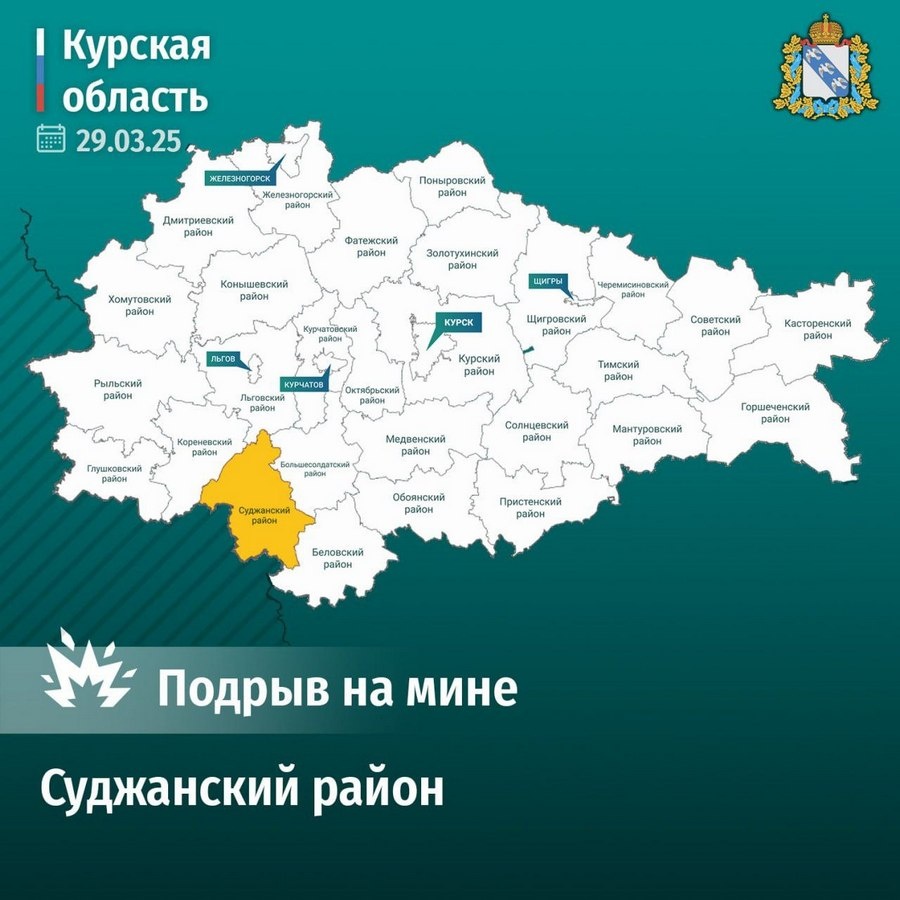 Вчера, 28 марта, в Суджанском районе подорвался на мине и получил серьезные ранения 39-летний мирный житель. Как сообщил врио губернатора Александр Хинштейн, это случилось между сёлами Борки и Плёхово.