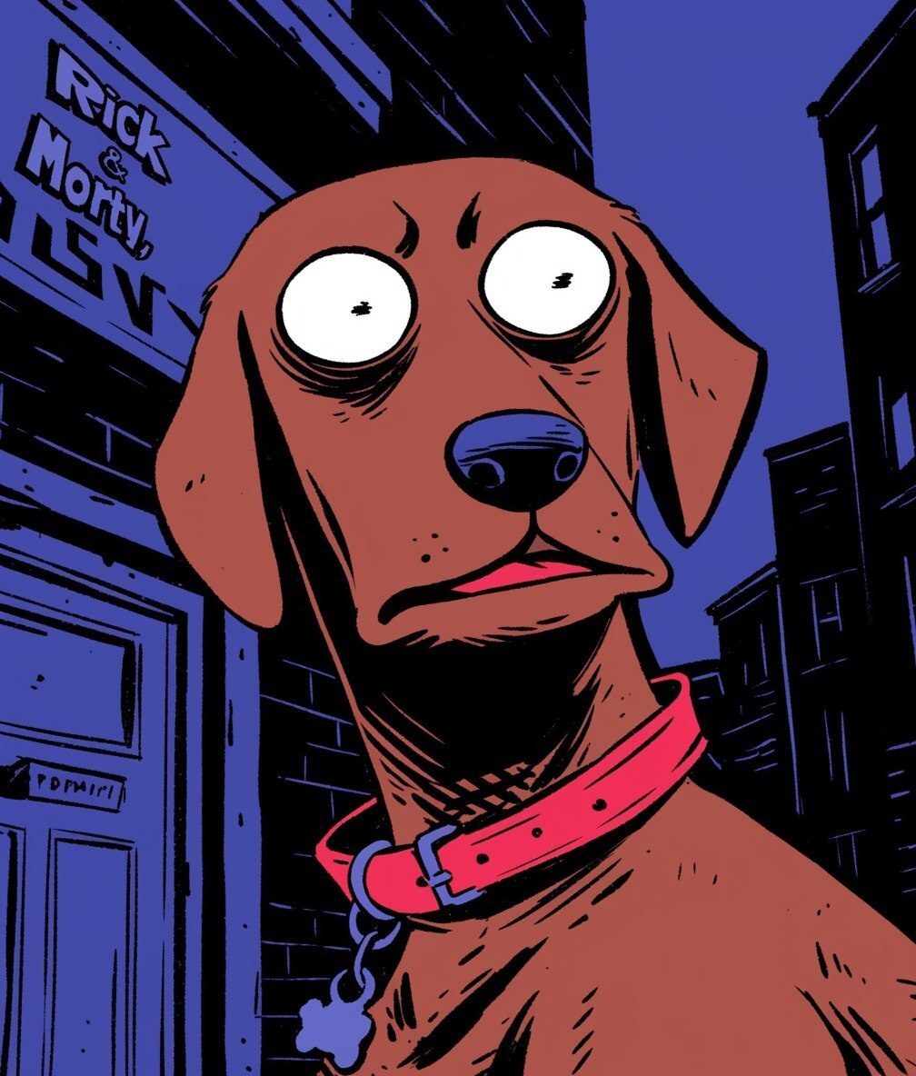 Создано на основе запроса: Environment: Screengrab from the cartoon "Rick & Morty," showing an anthropomorphic brown Labrador retriever with