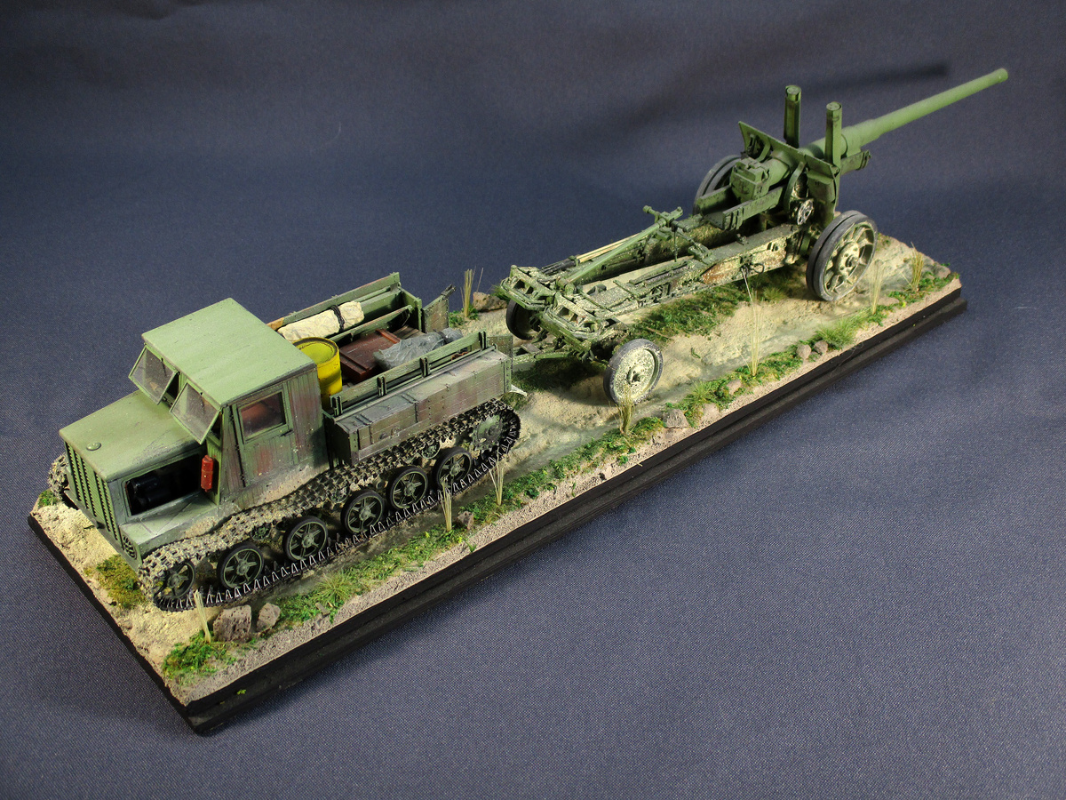 Была у меня одна замечательная деревянная коробочка из-под подарочной бутылки алкоголя. И была у этой коробки очень хорошая выдвижная крышка, для которой я искал какое-то применение. И вот, когда в моей коллекции появились трактор Я-12 и пушка А-19, я решил, что из деревянной крышки я сделаю подставку. Такая вот дощечка из натурального дерева. И длина, и ширина идеально подходят для создания композиции с тягачом и пушкой. Первым делом с помощью малярной ленты я сформировал бортики по краям подставки. Ничего сложного в этом нет. Затем спешал обычный речной песок, взятый на стройке, с клеем ПВА и сформировал поверхность будущей дороги. У меня имелась текстурная паста от Zip Maket, которую я нанёс поверх песка, когда тот просох. Поскольку данная текстурная паста не имеет, собственно, текстуры (ну или она уж слишком мелкая, чтоб можно было её разглядеть), я подсыпал чуть-чуть соды. Наперёд скажу, что не рекомендую использовать соду ни для каких задач в моделизме, слишком она ненадёжный мат