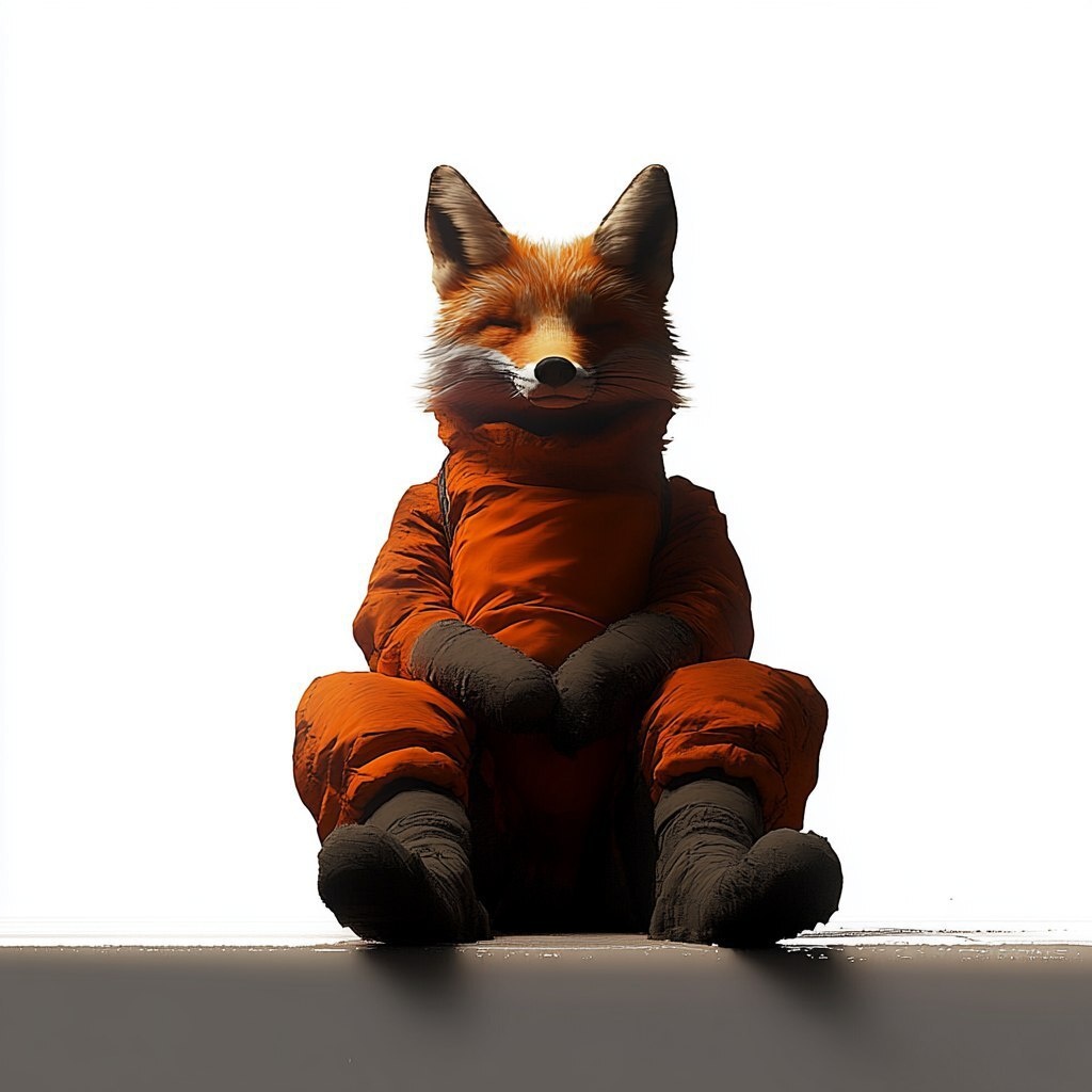 Создано на основе запроса: view, personification of a red fox, sitting front view wearing orange padding, white background