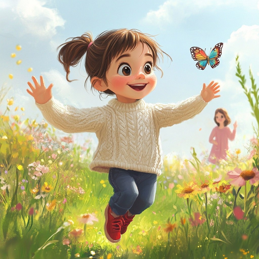 Создано на основе запроса: file:///Users/ida/Desktop/ChatGPT%20Image%202025%E5%B9%B43%E6%9C%8829%E6%97%A5%20%E4%B8%8B%E5%8D%8804_56_52.png has big expressive dark brown eyes, a cheerful smile, and a half-up ponytail hairstyle. She wears a cream cable-knit sweater, dark blue jeans, and red shoes. chasing a colorful butterfly through tall grass and flowers, his mother in the distance waving. 3DPixar style, animation, children's storybook, colourful and bright, niji6 --- Автоперевод: Файл: ///users/ida/desktop/chatgpt%20image%202025%E5%B9%B43%E6%9C%8829%E6%97%A5%20%E4%B8%8B%E5%8D%8804_56_52.png имеет большие темно-коричневые глаза, а также наполовину. Классно выглядит? 🤔 https://dzen.ru/id/65c0c65c86e4f837c27b24d7 #ИИ #AI #нейросеть #midjourney #art