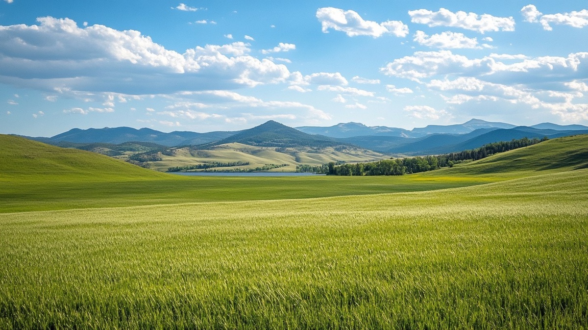 Создано на основе запроса: open fields and verdant hills, blue skies, montana, midday, HD, distant lake