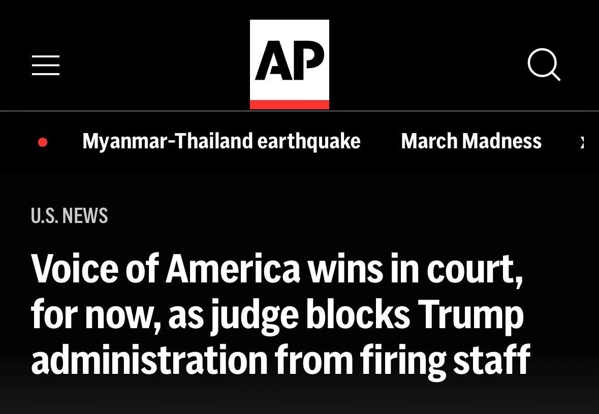 ⚡️Суд в США заблокировал попытку властей уволить сотрудников «Голоса Америки», — Associated Press.