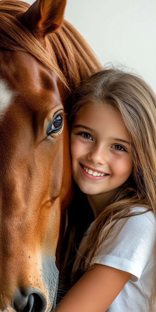 Создано на основе запроса: A high-quality photograph of a joyful young girl hugging her horse affectionately. She leans forward with a bright smile, her eyes full of happiness as she rests her head gently on the horse’s neck. The horse’s head is fully visible, looking calm and content. The girl is wearing a short-sleeved T-shirt, indicating warm summer weather. The background is completely white, creating a clean and minimalistic composition. The image is detailed and realistic, capturing the warmth and bond between the child and the horse.