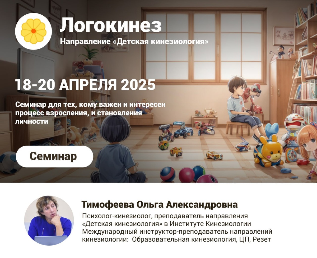 Дорогие друзья!🌿 Продолжается запись на семинар "Логокинез", который пройдет с 18 по 20 апреля 2025 года❗️ Семинар проведет Тимофеева Ольга Александровна — психолог-кинезиолог, преподаватель направления "Детская кинезиология в институте Кинезиологии (Москва) В ходе семинара разбирается теория и практика: ✅О блоках и сопротивлении, существующим у детей и взрослых ✅Алгоритм работы с саботажем ✅О гормонах-нейромедиаторах ✅О точках акупрессуры ✅Несколько методик таппинга ✅О важности цвета в нашей жизни ✅Медитации с цветом ✅Почему звуки влияют на наш организм ✅Об энергоинформационных центрах(чакрах) ✅Использование инструментов, изученных ранее для гармонизации чакр Подробнее о семинаре можно узнать в личных сообщениях группы ВК или по ссылке — https://kinesioportal.ru/events/event14552.php