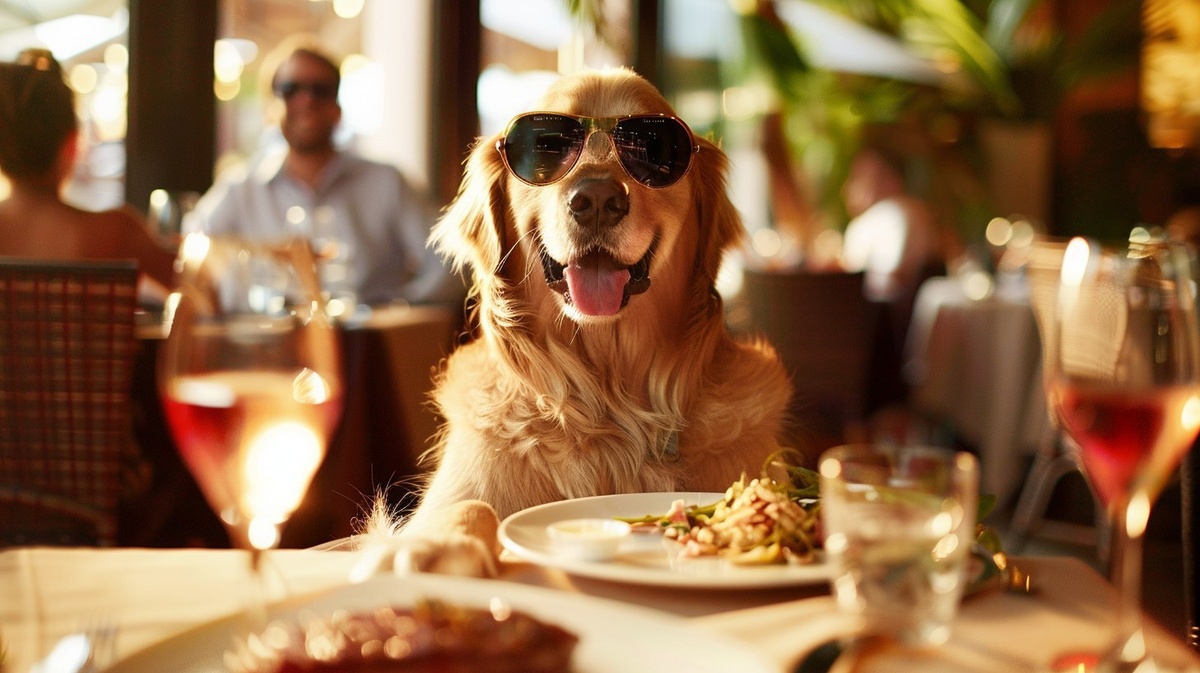 Создано на основе запроса: A happy golden retriever wearing oversized sunglasses, sitting at a fancy dinner table with a steak in front of him, confused waiters in the background, bright and cheerful lighting, ultra-realistic, 85mm lens,