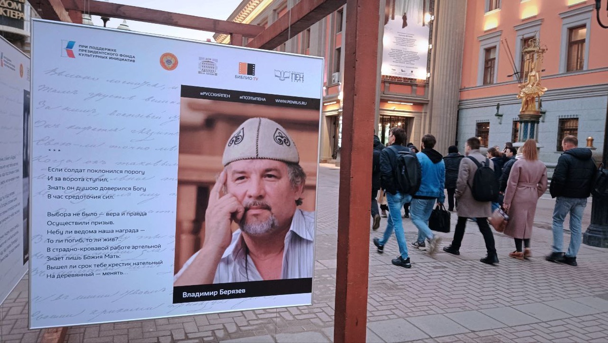 Вот так — бежишь на встречу с одним новосибирским поэтом, а встречаешь другого... на Арбате, аккурат напротив Дома Лосева и Вахтанговского театра, стоит уличная выставка, напомнившая мне проект «Поэту по портрету» Катерины Скабардиной. Зазывающей фотографией стал портрет Владимира Берязева. Остановилась. Поздоровалась со знакомыми, улыбнулась и дальше побежала. Приятно. Фото Анжелики ЛУКИНОЙ