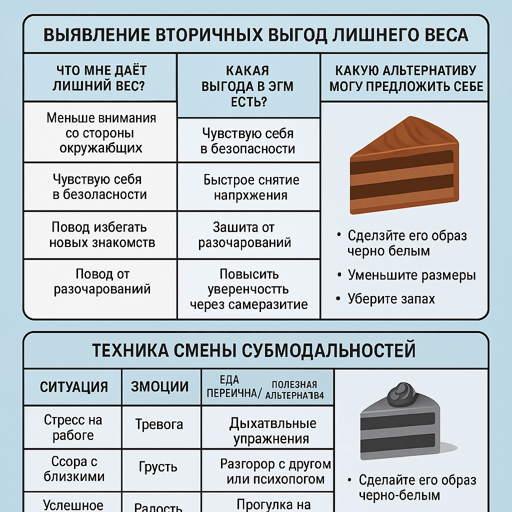 Похудение — это не только работа с телом, но и глубокая работа с собственными убеждениями и эмоциями. Иногда процесс тормозят психологические барьеры и скрытые выгоды лишнего веса, о которых вы даже не догадываетесь. Сегодня мы разберем, как выявить эти препятствия и научиться эффективно с ними работать. Часто лишний вес имеет скрытые психологические выгоды, которые удерживают вас от изменений. Например: Что мне даёт лишний вес? (Меньше внимания со стороны окружающих) Какая выгода в этом есть? (Чувствую себя в безопасности) Какую альтернативу могу предложить себе? (Найти уверенность в себе независимо от вес) 💡 Совет: Чем честнее вы заполните эту таблицу, тем быстрее поймете, какие психологические блоки мешают вам достигать целей. Лишний вес часто связан с эмоциональным заеданием. Чтобы выявить и проанализировать такие моменты, заведите дневник эмоций и питания. - Ситуация (Накричал начальник на работе) - Эмоции (Тревога) - Еда первична/вторична (Вторична) - Полезная альтернатива (Дых