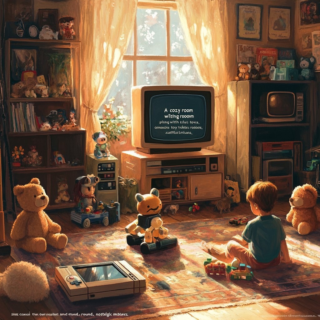 Создано на основе запроса: "A cozy 90s living room with children playing with classic toys, SNES console on the floor, toy robots, and stuffed animals scattered around, warm sunlight through curtains, nostalgic ambiance."