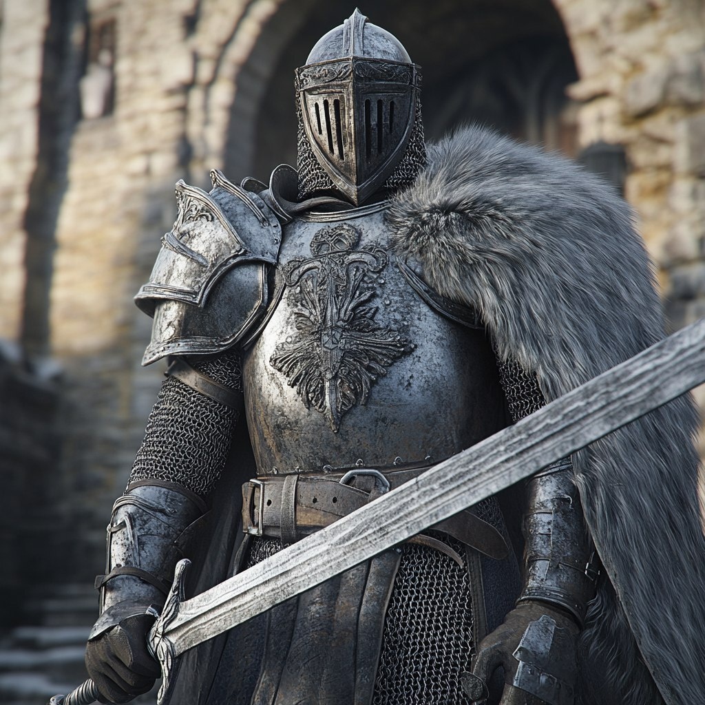 Создано на основе запроса: A knight in full medieval armor with several chainmail details with a large gray fur cape. He has a long and wide 2-handed sword. In a dynamic fighting stance. Ultra realistic 4k
