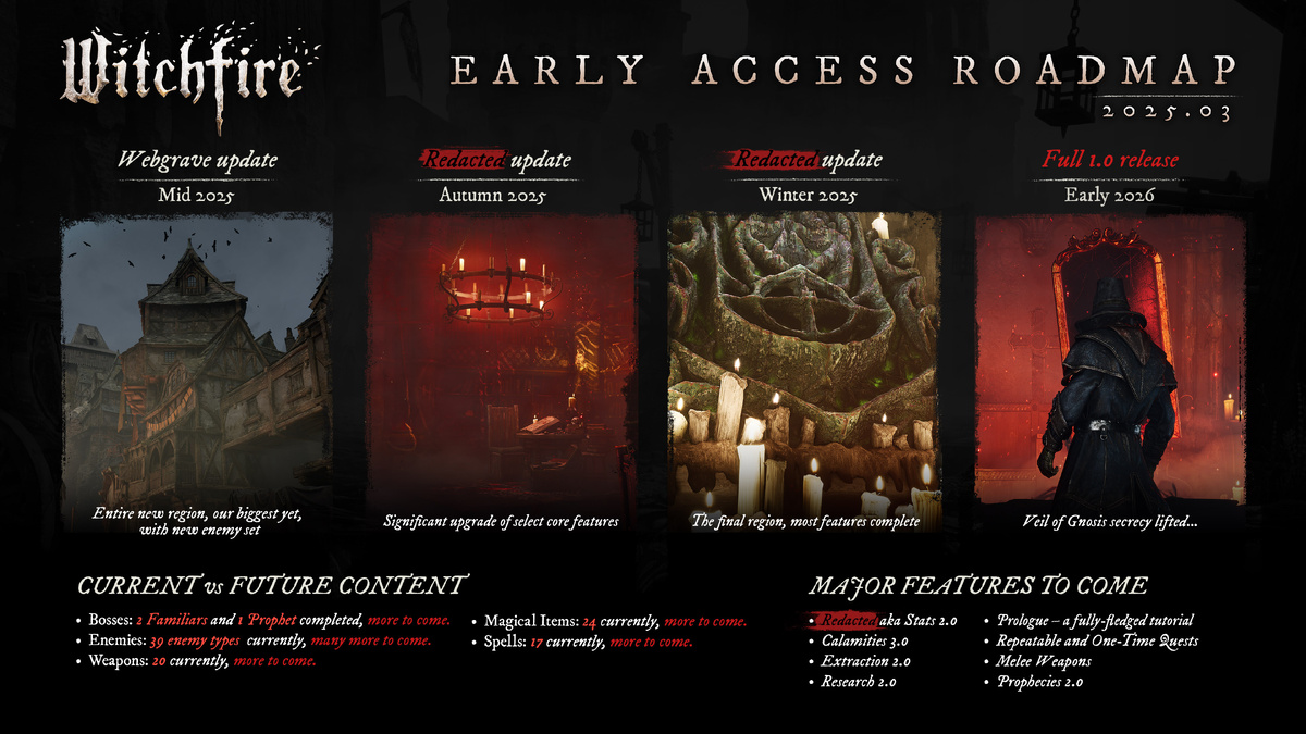 Разработчики Witchfire опубликовали в Steam обновлённую дорожную карту развития шутера. Они перенесли крупный апдейт Webgrave с весны на лето 2025 года, а вот полноценный релиз всё ещё в планах на начало 2026 года. После релиза Webgrave, который обновит механики, разработчики переключаться на следующий апдейт. Он также внесет изменения в механики, а его детали будут известны ближе к релизу. После этого будет третьей обновление с новым регионом и финальными главами игры. Студии The Astronauts пока не готова говорить о локализации игры на конкретные языки, но работа в этом направлении ведётся, и о ней расскажут позже. Что касается портирования шутера на консоли, то сейчас команда в процессе найма соответствующего эксперта, который оценит сложность и поможет осуществить задумку. С релиза в раннем доступе в сентябре 2023 года Witchfire получила уже 5 крупных обновлений, 27 патчей и 6 фиксов. Шутер доступен в Steam и EGS. Комментарии на сайте