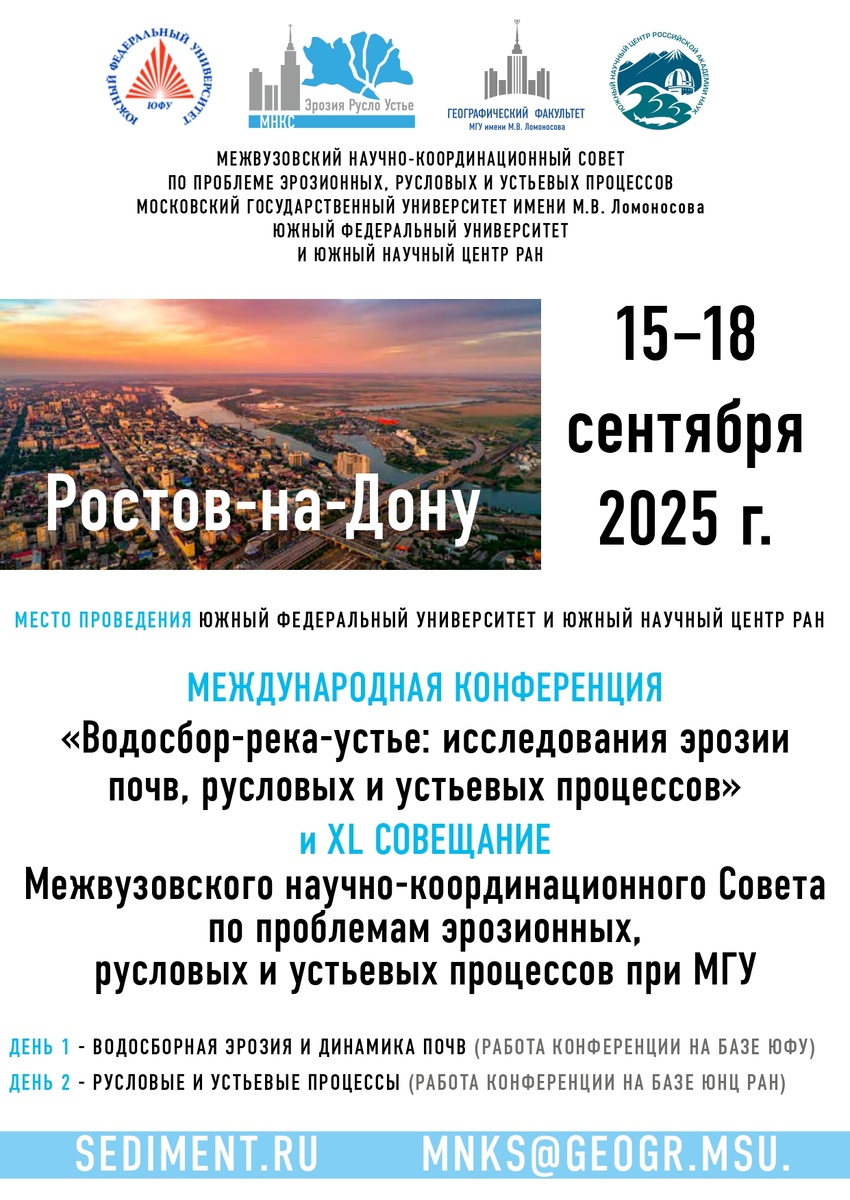 15 – 18 сентября 2025 г. в Ростове-на-Дону, в Южном федеральном университете и Южном научном центре РАН состоится Международная конференция «Водосбор-река-устье: исследования эрозии почв, русловых и устьевых процессов» и XL совещание Межвузовского научно-координационного Совета по проблемам эрозионных, русловых и устьевых процессов при МГУ. Организаторы конференции: Межвузовский научно-координационный Совет по проблемам эрозионных, русловых и устьевых процессов при МГУ, Южный федеральный университет и Южный научный центр РАН. Конференция будет проходить в очном формате. Для участия в конференции приглашаются ученые, занимающиеся эрозионными, русловыми и устьевыми процессами. Для участия в конференции просим Вас в срок до 15 апреля 2025 г. пройти электронную регистрацию по ссылке, а также прислать тексты тезисов на электронную почту mnks@geogr.msu.ru (тема письма «Текст тезисов»). Подробная информация о сроках проведения конференции, сроках подачи материалов, правилах оформления тезисов