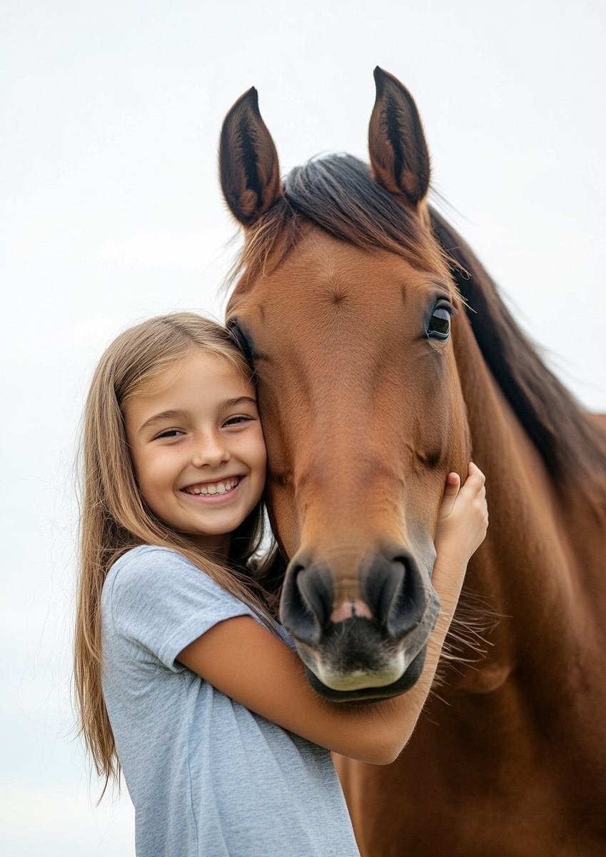 Создано на основе запроса: A high-quality photograph of a joyful young girl hugging her horse affectionately. She stands close to the horse, wrapping her arms around its strong neck, with a bright smile and eyes full of happiness. The horse stands calmly with its head slightly turned towards the girl, looking content. The entire front half of the horse is visible, including its front legs, while the girl is fully visible in the frame. She is wearing a short-sleeved T-shirt, suitable for warm summer weather. The background is completely white, creating a clean and minimalistic look. The image is detailed and realistic, capturing the warmth and deep bond between the child and the horse. --- Автоперевод: Высококачественная фотография радостной молодой девушки, ласково обнимающей свою лошадь. Необычно получилось? 🤔 https://dzen.ru/id/65c0c65c86e4f837c27b24d7 #ИИ #AI #нейросеть #midjourney #art