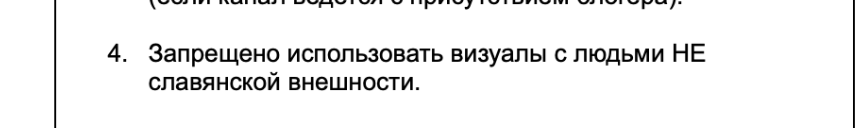 А что это за требование такое при монтаже рекламы Яндекса? Это законно вообще? Если я правильно помню, то большая часть РФ находится в Азии и, соотвественно, там живут граждане России НЕ славянской внешности. Так что это прямая дискриминация граждан Российской Федерации.