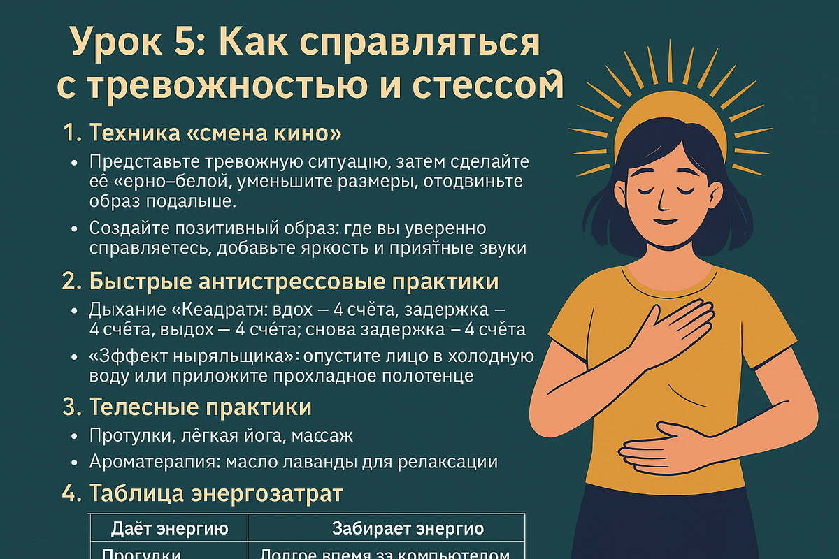 Современный ритм жизни оставляет мало шансов на расслабление, и часто тревожные мысли накрывают нас с головой. Стресс мешает не только ментальному благополучию, но и физическому здоровью. Особенно это касается тех, кто нацелен на похудение и поддержание здорового образа жизни. Сегодня я расскажу о проверенных техниках и практиках, которые помогут справляться с тревожностью и быстро возвращать себе внутреннее равновесие. Наш мозг — это режиссёр, который создаёт фильмы из переживаний и страхов. Техника "смена кино" помогает уменьшить влияние тревожных мыслей и заменить их позитивным сценарием. 🎯 Результат: Вы перепрограммируете свой мозг, учитесь воспринимать стрессовые ситуации с меньшим напряжением и уверенностью в своих силах. Когда тревожность подкрадывается внезапно, на помощь приходят простые и быстрые техники, которые можно выполнять в любой момент. 💡 Почему это работает: