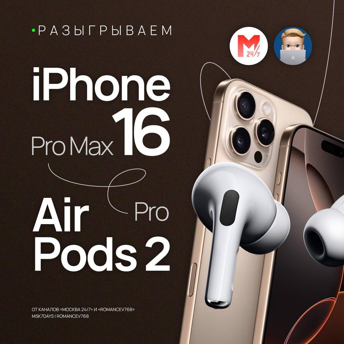 В ответ на пост Уже завтра финал большого розыгрыша с 3мя призами 1 место iPhone 16 Pro Max на 1 TБ 2 место AirPods Pro 2 3 место AirPods Pro 2 На момент подведения итогов надо быть подписанным на @romancev768 и @msk7days Участвуют все нажавшие кнопку под этим постом https://t.me/Romancev768/11947