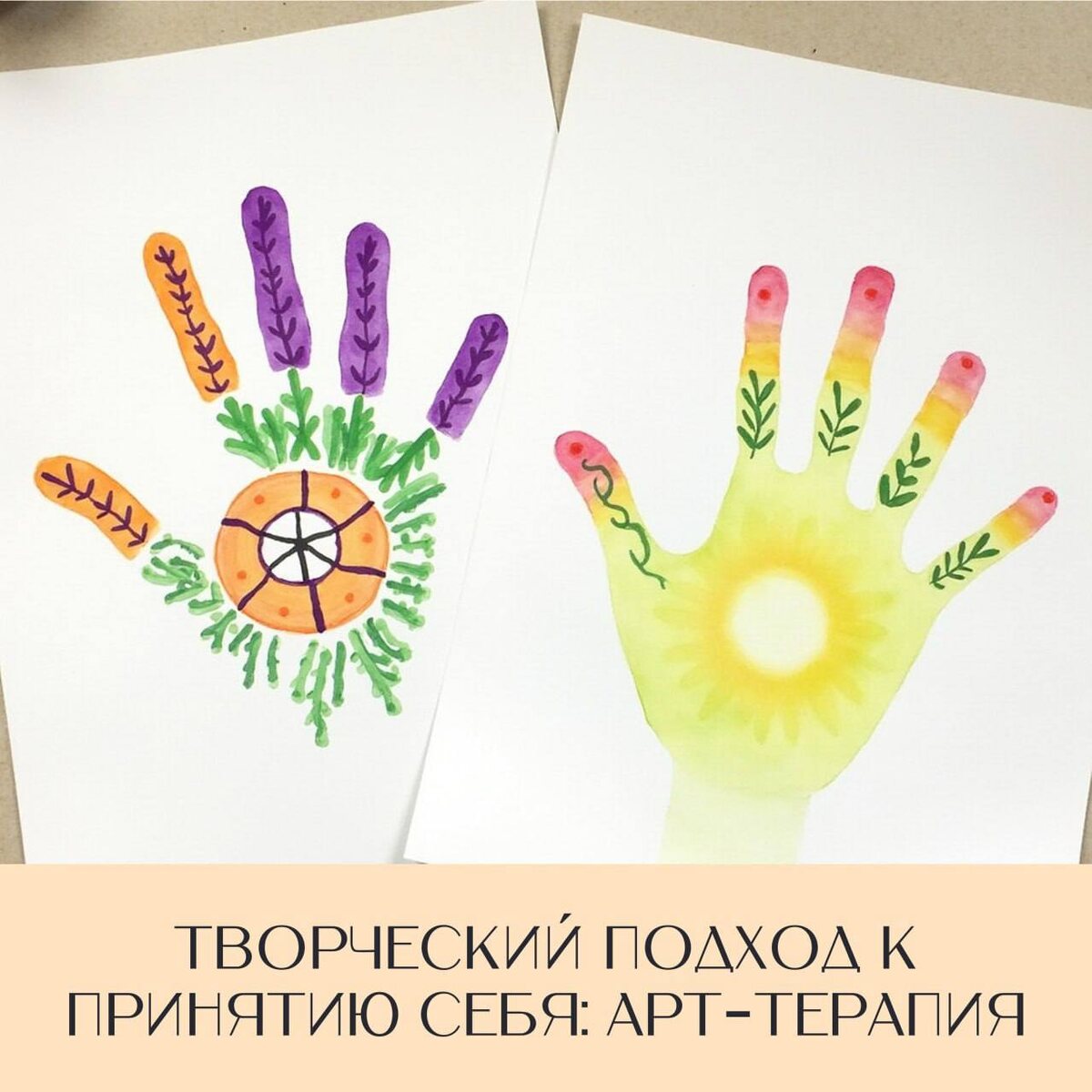 Творческий подход к принятию себя: арт-терапия ➡️ Боитесь совершить ошибку? Стремитесь к идеалу во всем, но постоянно чувствуете себя недостаточно успешным? Есть способ, который поможет вам принять свои недостатки и увидеть в них силу. Чтобы исследовать свой внутренний мир и почувствовать себя целостной личностью, попробуйте арт-терапию. 💡 Идея состоит в том, чтобы выразить свои чувства и мысли через искусство, даже если у вас нет художественных навыков. Важно не то, насколько красивым получится результат, а то, что вы почувствуете в процессе. Для этой практики нам понадобится: ▶️ Два листа бумаги, ▶️ Цветные карандаши, ▶️ Техника «Работа с ладонями». 1⃣Возьмите два листа бумаги. На одном листе обведите свою левую ладонь, на другом — правую. 2⃣ На каждом пальце правой ладони напишите свои положительные качества. Подумайте, что вам нравится в себе, в чем ваша сила. Это могут быть как черты характера, так и ваши умения. 3⃣На пальцах левой ладони напишите то, что вам не нравитс
