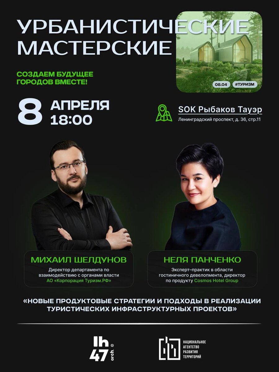 🏘Урбанистические Мастерские | Туризм Уже 8 апреля мы приглашаем гостей на Живой диалог по теме «Новые продуктовые стратегии и подходы в реализации туристических инфраструктурных проектов»!✔️ ▪️ Почему стоит прийти? 🔘Равноправное участие – нет формальностей и монологов, мнение каждого ценно 🔘Открытость и доверие – честный диалог о вызовах и возможностях рынка 🔘Нестандартные решения – свежий взгляд на развитие городов 🔘Настоящий нетворкинг – крепкие связи с ключевыми игроками отрасли ▪️ Кто будет? 🔘Выступления приглашённых спикеров: — Михаил Шелдунов — Директор департамента по взаимодействию с органами власти «Корпорация Туризм РФ» — Неля Панченко — Эксперт–практик в области гостиничного девелопмента, директор по продукту Cosmos Hotel Group 🔘3 круга обсуждений: уникальный формат живого диалога, где каждый участник вовлечён в обсуждение и формирует повестку встречи. 🔘Панельная сессия с экспертами: — Антон Басин — Президент Ассоциации загородных отелей, основатель «Basinn Ho