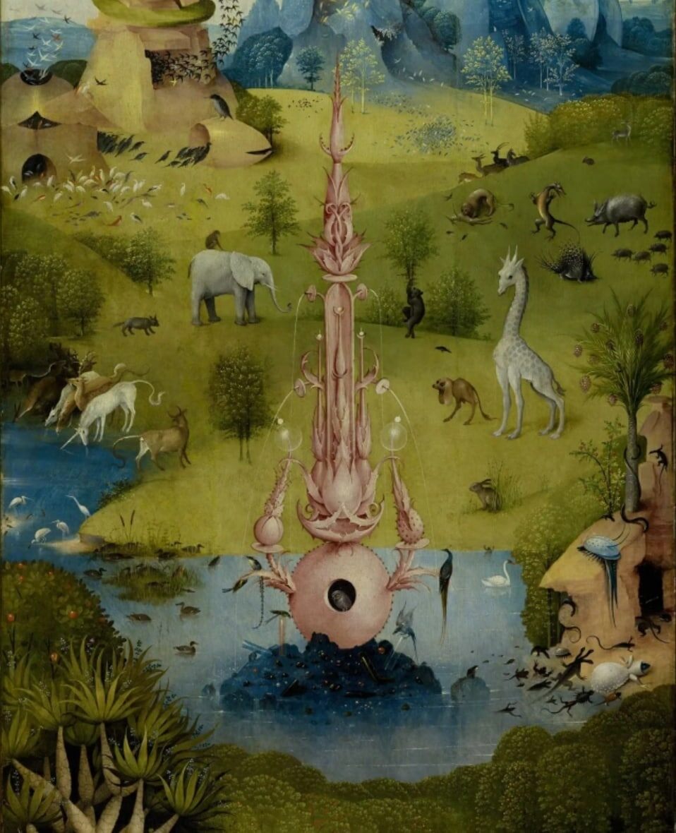 Внимательно посмотрите на картину. Это кусочек полотна Босха, называется "Сад райских наслаждений". Недавно в Москве была выставка Босха, и я залип возле этой картины где-то минут на двадцать: рассматривал со всех сторон, пытался понять, что автор вложил в картину.