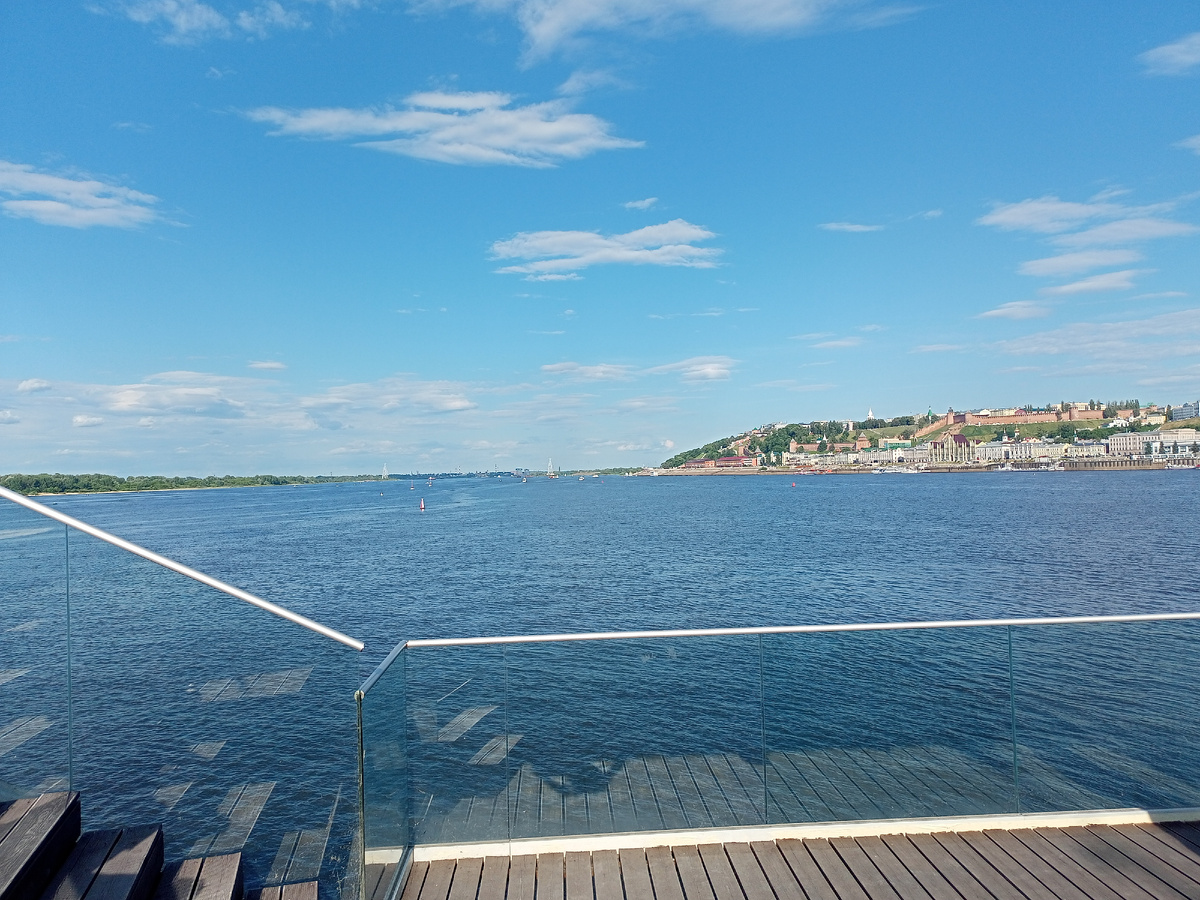 Заселился и пошёл знакомиться с городом. Из плюсов- рядом "Ашан" и метро. Поел и в путь! Но сперва я отправился на Стрелку, не на такую, как в лихие 90-е, а в то место, где встречаются Ока и Волга. Очень интересное и подготовленное для туристов место, есть даже трибуны, где можно посидеть и полюбоваться красотой рек, а заодно и Нижегородским кремлём на противоположном берегу.