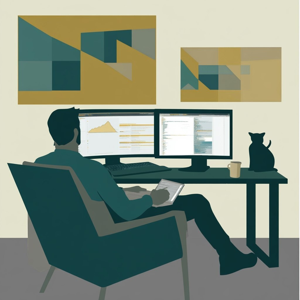 Создано на основе запроса: illustration of happy man working on dual computer screen in his home office with child and pet in background