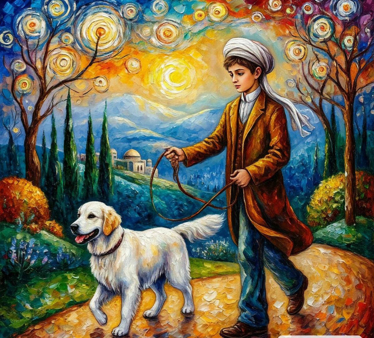 Шейх гордо и бодро прошествовал мимо, Парнишка в руке нес его поводок. Ответственно это: прогулка с мальчишкой, - Хозяину нужен свободы глоток! Глоток яркой смеси тумана и почек, Едва пробудившейся юной весны… Всю полифонию звучания ночи они, Непременно, услышать должны! О, если б не друг, он сидел бы читая, Вдыхая в себя пыль и мудрость из книг… Пес тащит его, на протест не взирая, Гулять и бродить, и ловить счастья миг. Ред.28.03.2025г.