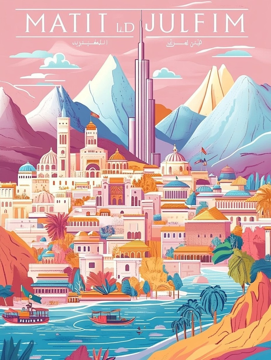 Создано на основе запроса: A vibrant illustration of Dubai’s landscape, featuring Dubai’s skyline, the Burj Khalifa, Palm Jumeirah, with elements like traditional dhows, souks, and camels. bright colors, graphics, cartoon illustrations, light pink tones, focusing on details of architecture,