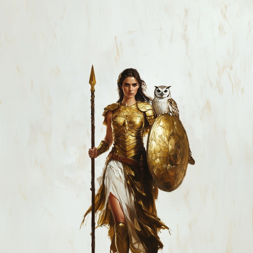 Создано на основе запроса: Athena, the goddess of wisdom and war in ancient Greek mythology, solid white background, with an owl perched on