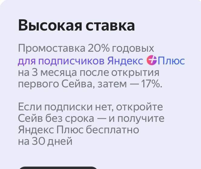 Для того, чтобы пользоваться преимуществами этой карты, нужно иметь подписку Яндекс плюс. Сейчас при открытии Яндекс сейфа получите подписку бесплатно на 30 дней. Ставка по накопительному счету для новичков 20% на 3 месяца, после 17%. Проценты начисляют и выплачивают каждый день. Для открытия Яндекс сейфа обязательно должна быть карта Яндекс Пэй, открыть её можно по ссылке здесь.