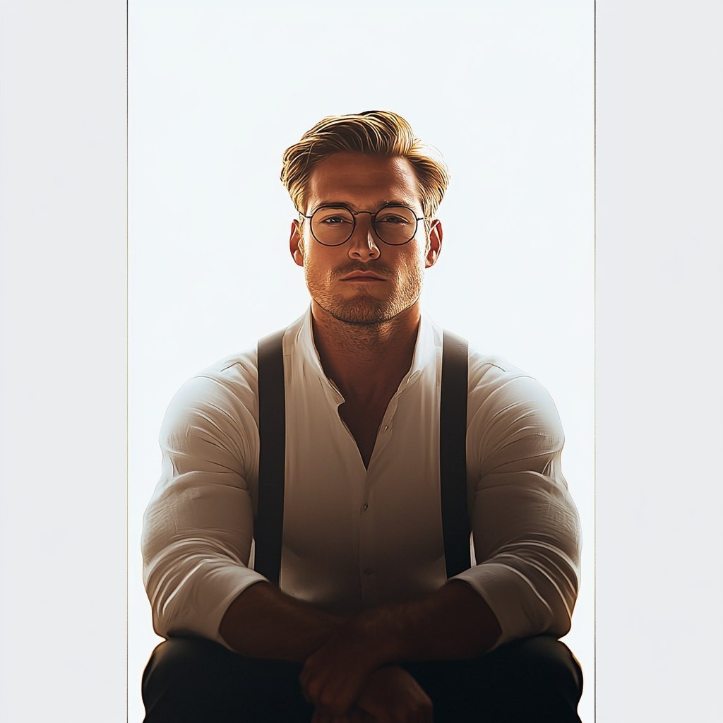 Создано на основе запроса: man in the West, blond slicked-back hair, gentleman, white shirt, black suspenders, glasses