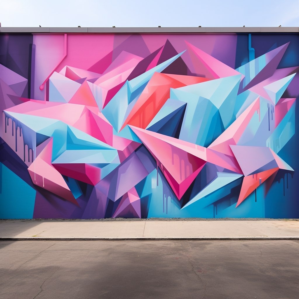 Создано на основе запроса: A geometric graffiti mural on a raw concrete wall, featuring an explosion of sharp, polygonal shapes in a smooth