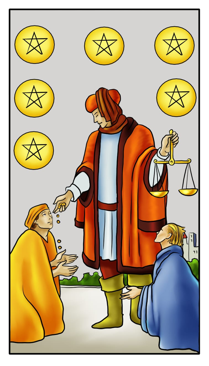Шестёрка Пентаклей — очень интересная и, на первый взгляд, простая карта. Мы видим на ней человека, который делится — даёт милостыню двум просящим, стоящим на коленях. И вроде бы всё ясно: помощь, щедрость, поддержка. Но, на самом деле, не всё так однозначно.