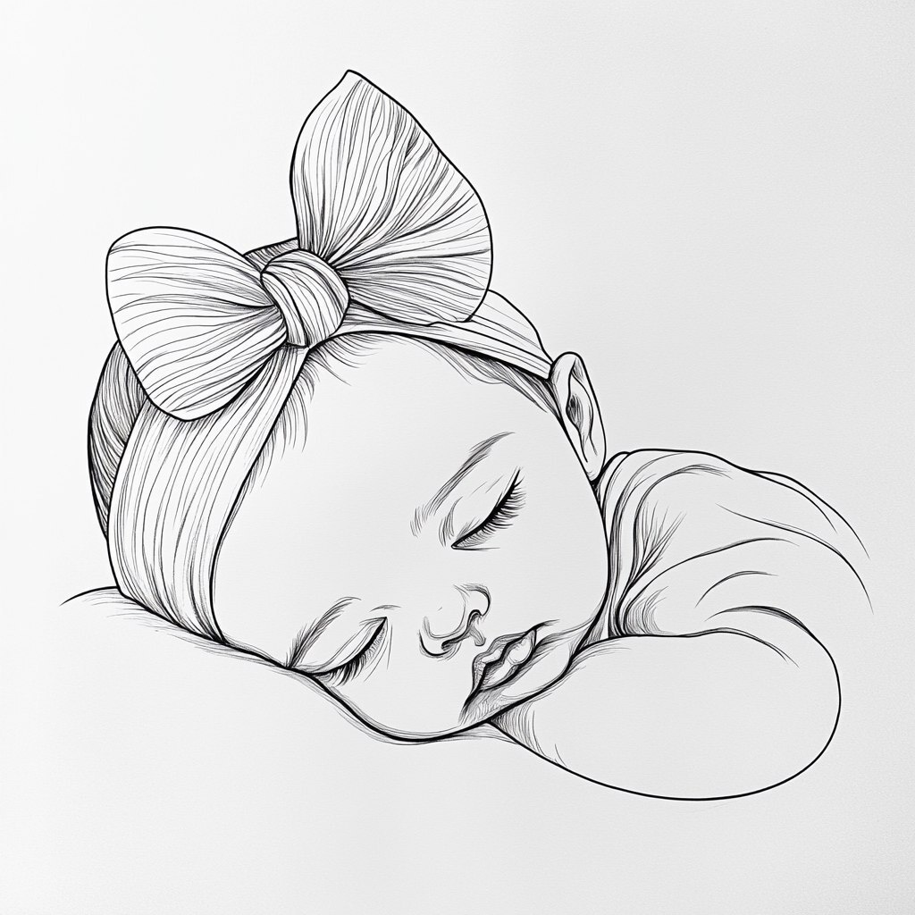 Создано на основе запроса: black and white new born Baby girl, line art, Pixar style, bow hat, sleepy