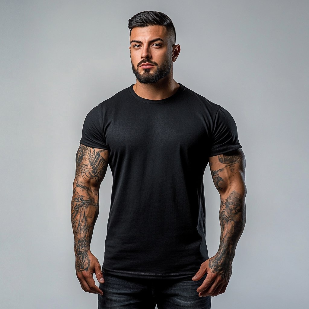 Создано на основе запроса: Oversized black t-shirt, a realistic handsome muscular strong man by Brazilian standards wearing it, looking forward, modern style t-shirt design, showing the front of the t-shirt well against a grayish white background.
