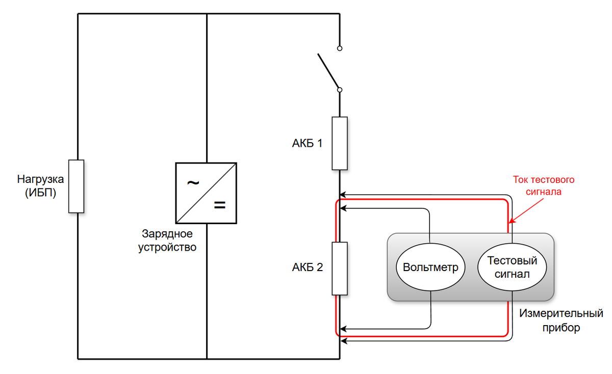 Чтобы понять, почему на показания сопротивления батареи может влиять что-то ещё, можно рассмотреть путь прохождения тестового сигнала. На рисунке 1 измеряется сопротивление батареи № 2, а ток тестового сигнала показан красным. Рубильник разомкнут и весь ток тестового сигнала проходит через батарею № 2.