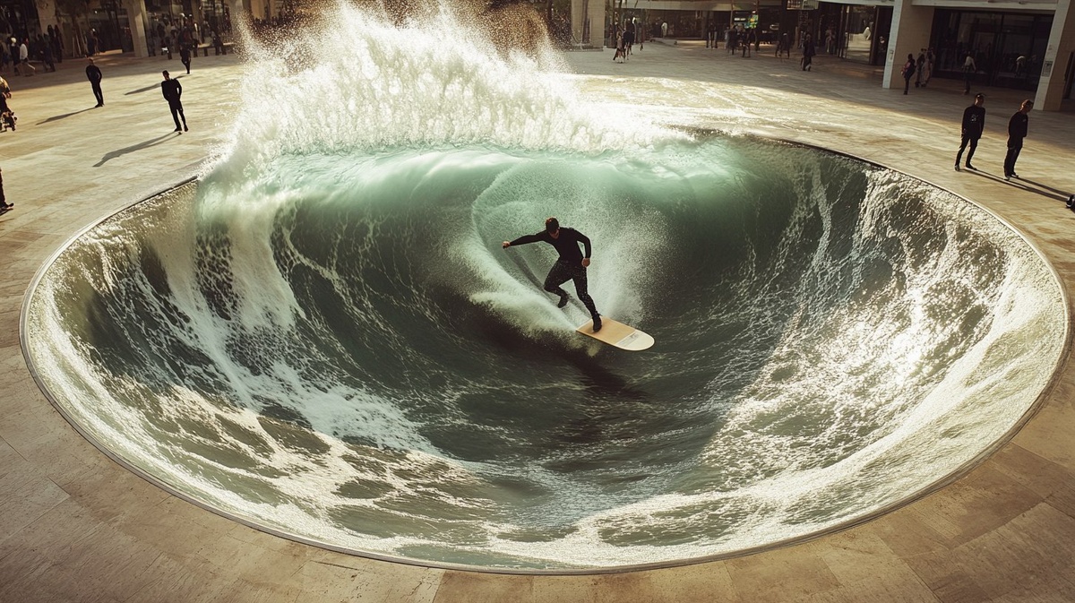 Создано на основе запроса: a skateboard bowl except it has high pressure tropical looking water mimicking high quality surf in a 360 degree constant wave in it like a huge basin with the purpose of being able to surf it