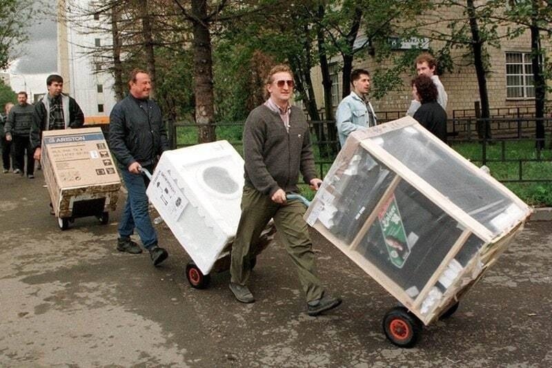 Москвичи тащат из магазина бытовую технику и электронику, август 1998 г.