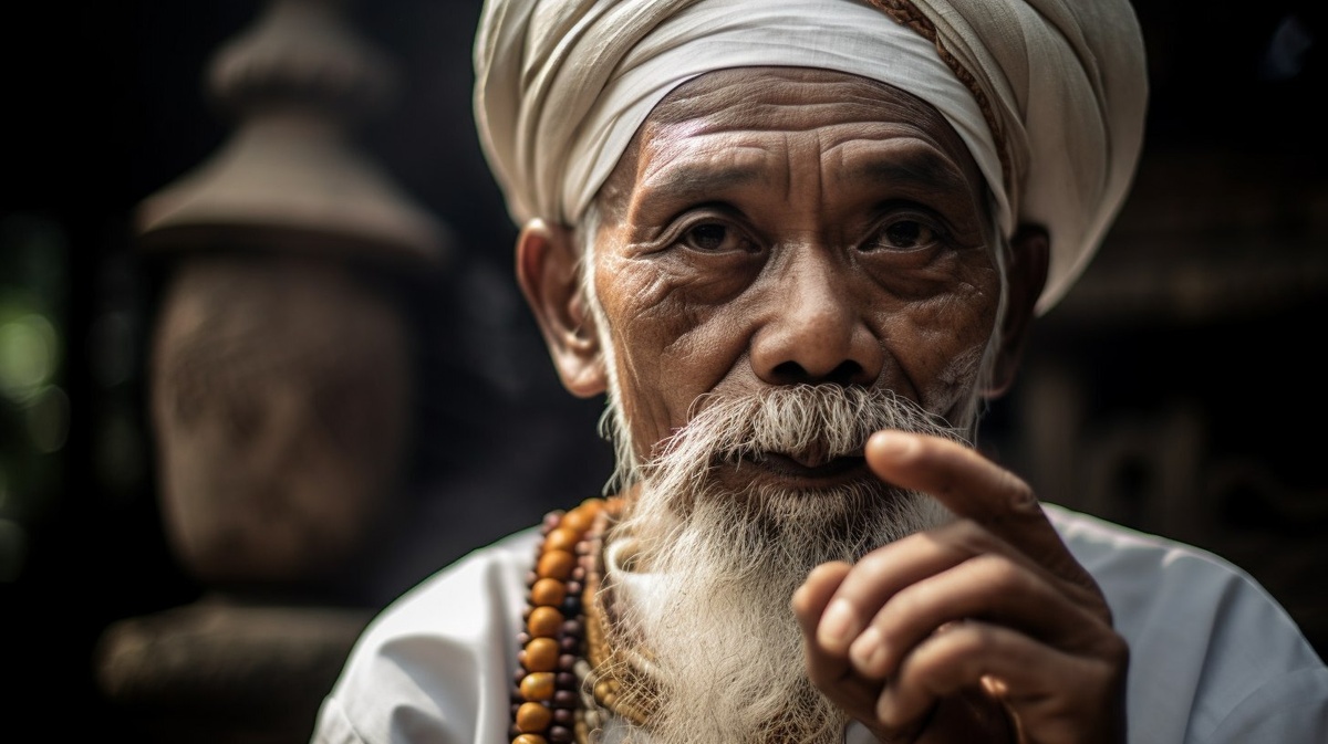 Создано на основе запроса: A close-up portrait of an elderly Balinese shaman (balian) with white beard and mustache