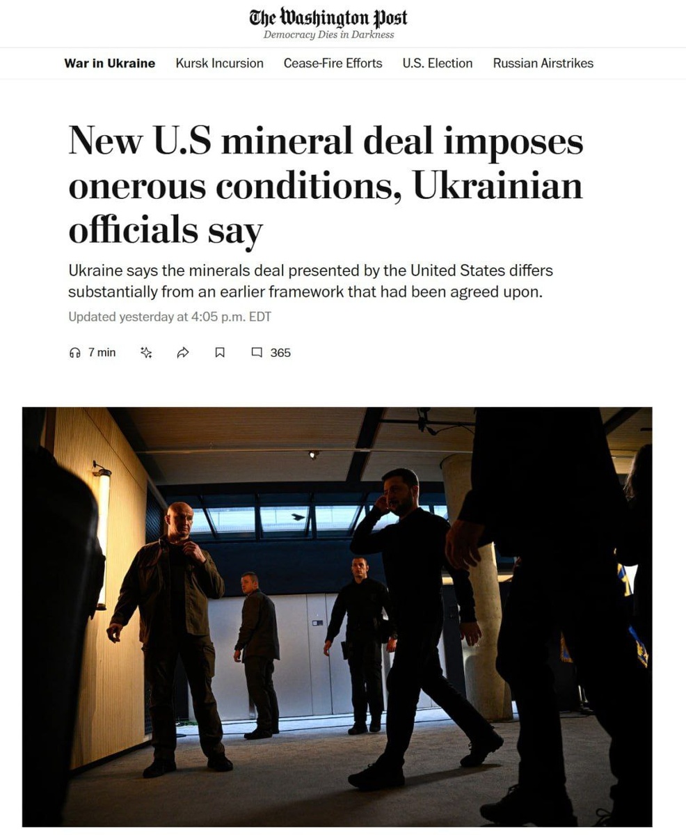 ▪️Издание, ссылаясь на украинских чиновников, пишет, что последний вариант соглашения все еще не имеет никаких гарантий безопасности и сформулирован, как механизм компенсации средств, предоставленных США.