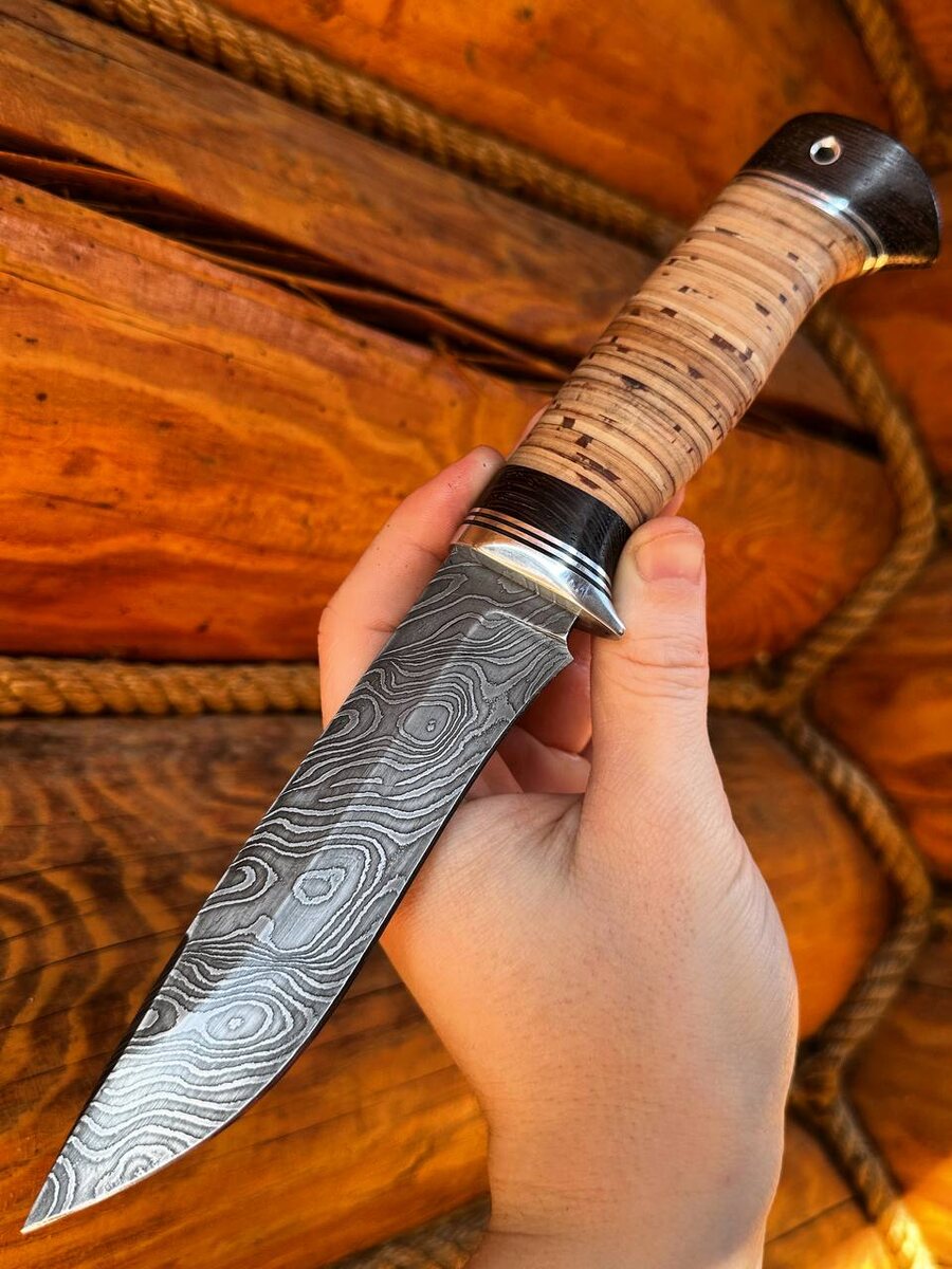 Рукоять на ноже выполнена из бересты, не скользит в руке и не боится влаги.