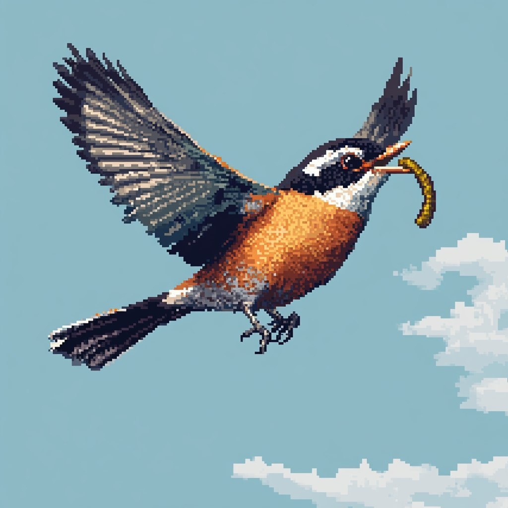 Создано на основе запроса: use 32 bit pixelation to draw a bird, american robin flying with a worm in its mouth.