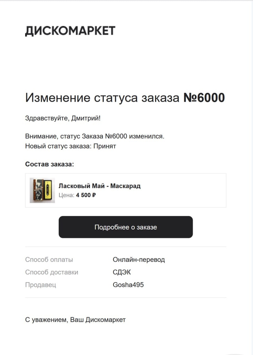 Доверие потребителя к продукту в немалой степени определяется отношением к нему владельца. Если менеджеры АвтоВАЗа ездят на Мерседесах, то стоит задуматься. Для меня лично ДискоМаркет - одна из площадок для покупок, которой я регулярно пользуюсь С момента запуска сайта я сделал 33 заказа и купил около 50 пластинок. И, наверное, символично, что шеститысячный заказ именно мой. Хейтеры по поводу музыкального материала в заказе могут засунуть своё мнение туда, куда солнце не заглядывает.