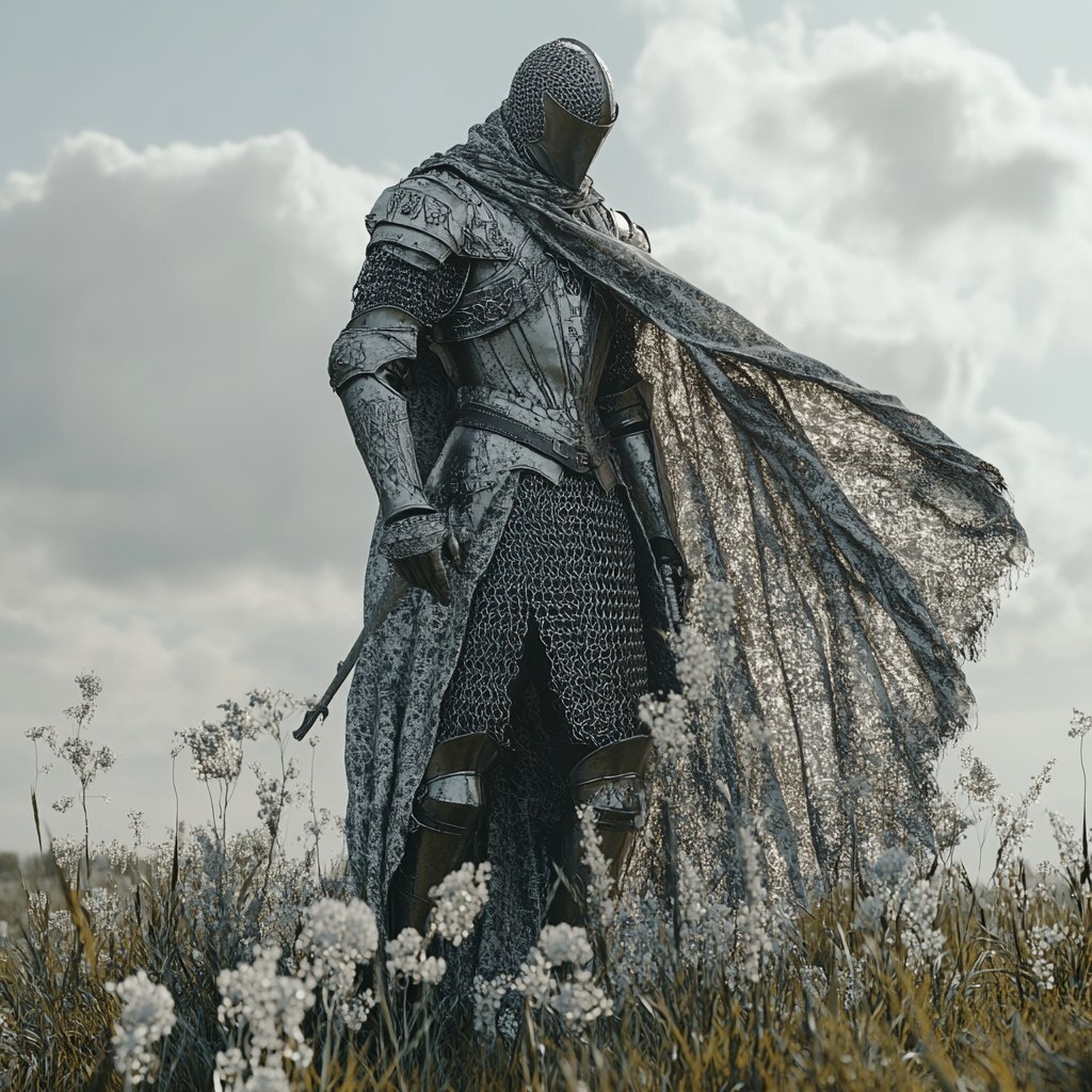 Создано на основе запроса: Un chevalier en armure médiévale complète, avec une cotte de mailles unique et une grande cape de fourrure grise