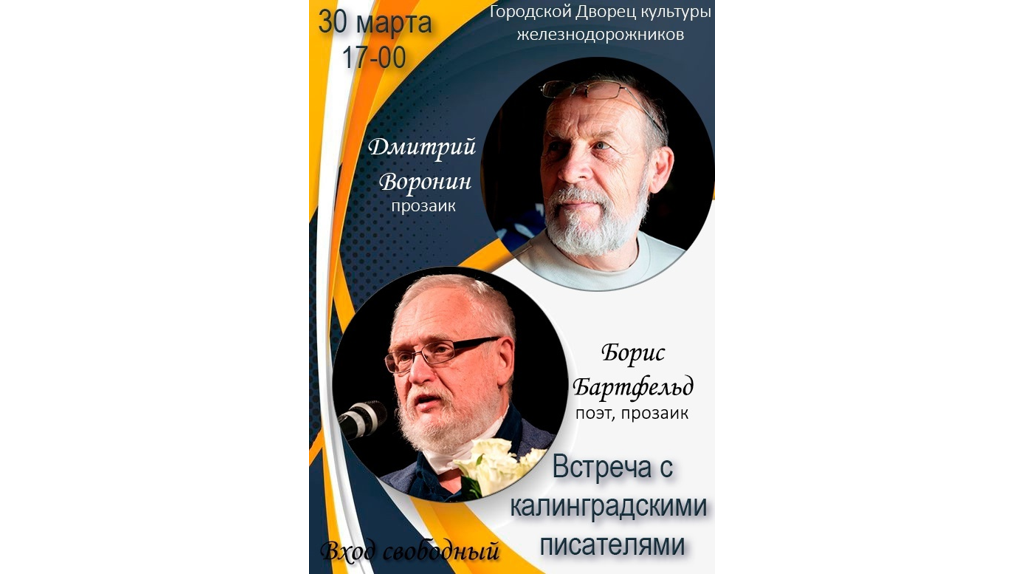 В Городском Дворце культуры железнодорожников пройдет литературная встреча с калининградскими писателями Борисом Бартфельдом и Дмитрием Ворониным. Она состоится в воскресенье, 30 марта. Начало в 17:00. Писатели расскажут о себе и о своих проектах, поделятся писательским советами, прочитают свои произведения. Борис Бартфельд, писатель, автор семнадцати книг художественной прозы и поэзии, книг по истории края, председатель Калининградской областной писательской организации, член правления регионального отделения Российского фонда культуры, главный редактор журнала «Балтика», организатор международных литературных конкурсов и фестивалей, в т.ч. одного из самых крупных и известных в стране – конкурса- фестиваля «Русский Гофман», Курановского конкурса миниатюр; конкурса фантастического рассказа «Прыжок над бездной».
