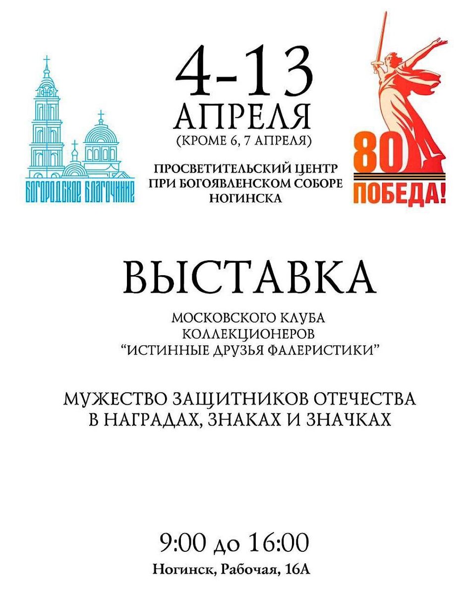 В преддверии 80-летия со Дня Победы в Великой Отечественной войне в Просветительском центре при Богоявленском соборе Ногинска будет проходить передвижная выставка «Мужество защитников Отечества в наградах, знаках и значках», организованная Московским клубом коллекционеров-фалеристов. Каждый экспонат — это не просто предмет коллекционирования, а живое свидетельство мужества и отваги защитников Родины. У нас есть уникальная возможность прикоснуться к героической истории страны. Выставка будет проходить в период с 4 по 13 апреля (кроме 6 и 7 апреля) с 9.00 до 16.00.