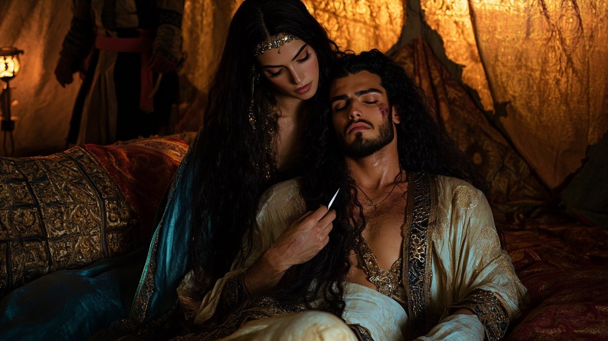 Создано на основе запроса: A dramatic and emotional scene inspired by the biblical story of Samson and Delilah. A powerful, muscular man with long, flowing black hair sits asleep on Delilah’s lap in a richly decorated Middle Eastern-style tent illuminated by soft, golden lamplight. Delilah, a beautiful woman with long dark hair and elegant robes, holds a pair of ancient scissors as she carefully cuts a thick strand of his hair. Her expression is a mix of sadness and determination. In the background, shadows of Philistine soldiers wait silently, ready to capture Samson once his strength is gone. The atmosphere is tense, intimate, and full of betrayal. --- Автоперевод: Драматическая и эмоциональная сцена, вдохновленная библейской историей Самсона и Далилы. Как тебе эта картинка? 🤔 https://dzen.ru/id/65c0c65c86e4f837c27b24d7 #ИИ #AI #нейросеть #midjourney #art